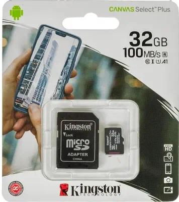 Основные характеристики карты памяти microSDHC UHS-I U1 Kingston Canvas Select Plus 32 ГБ, 100 МБ/с, Class 10, SDCS2/32GB, 1 шт, с переходником SD: